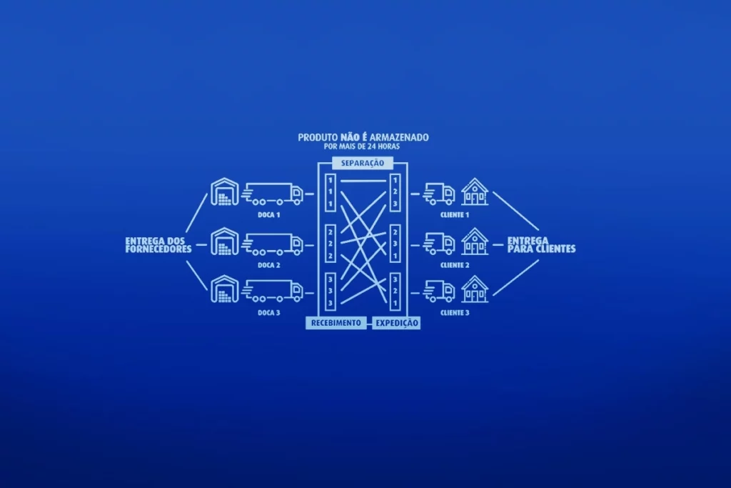 Absolutamente nenhum. Não existe um armazém para guardar as mercadorias, deixando-as paradas por algum tempo. Ou seja, não existe o processo de estocagem dos produtos. Sua empresa precisa somente de uma área de carga e descarga eficiente e um sistema de gestão dos pedidos que apresente o mínimo possível de falhas.