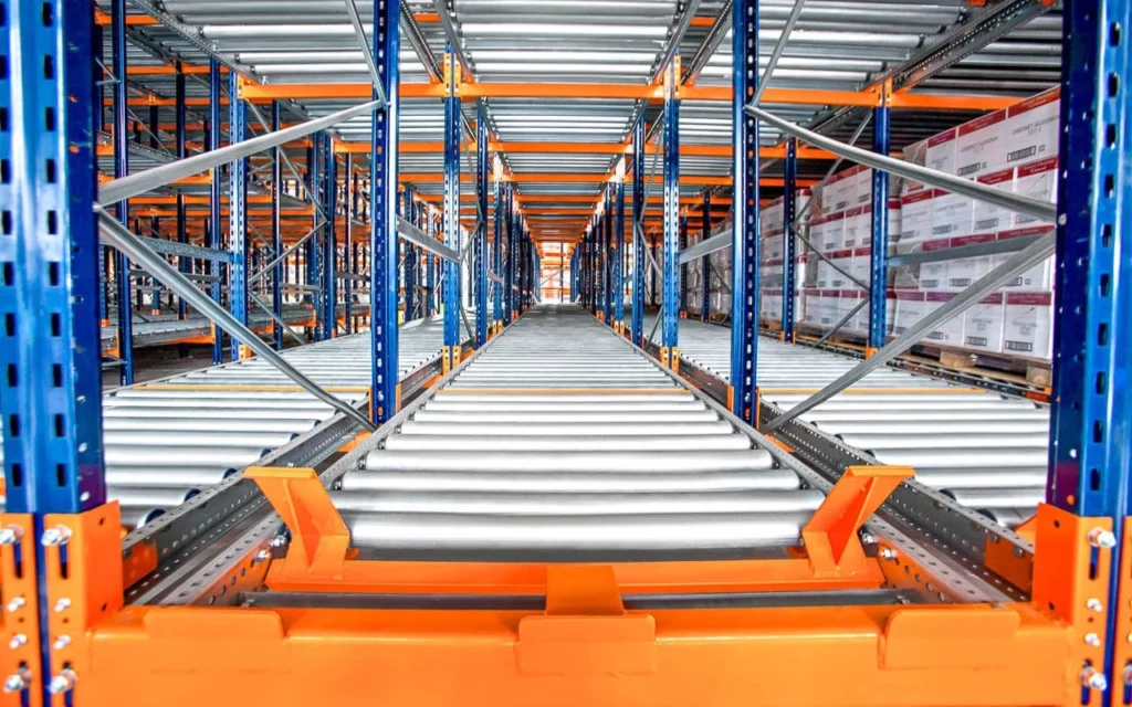 Sua estrutura é formada por estantes de armazenamento com planos inclinados e pistas de roletes que movimentam a carga por ação da gravidade e fluxo automático. Mantém velocidade constante, pois são usados em toda extensão das pistas reguladores de velocidade e separadores.